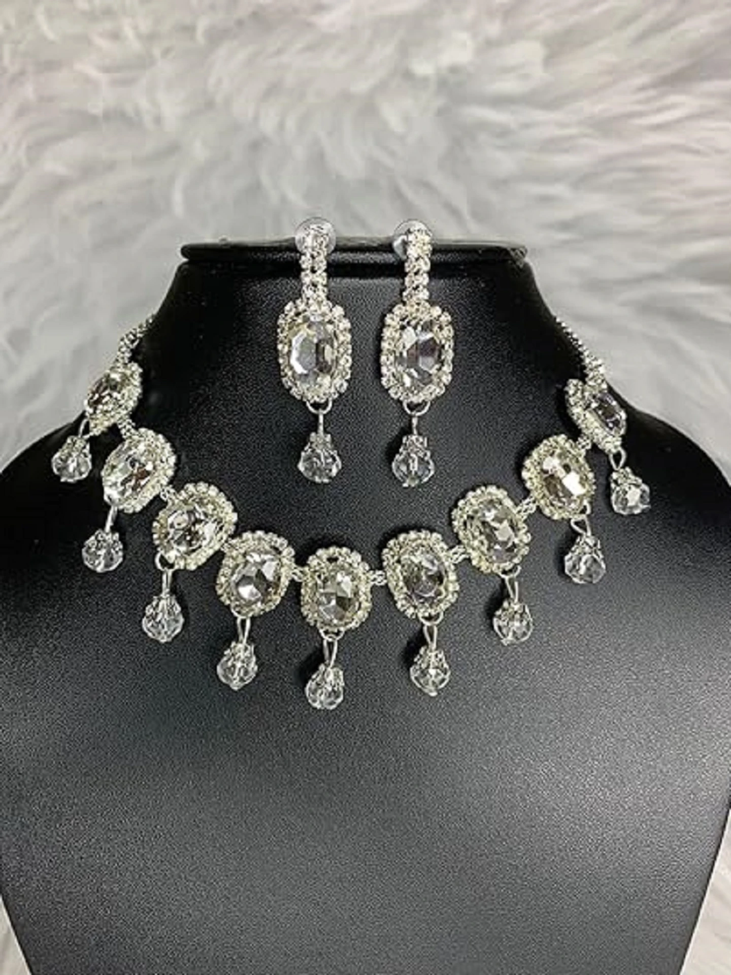 Crystal Oval Choker Necklace Set with Earrings – Silver Plated Drop Bridal Jewellery