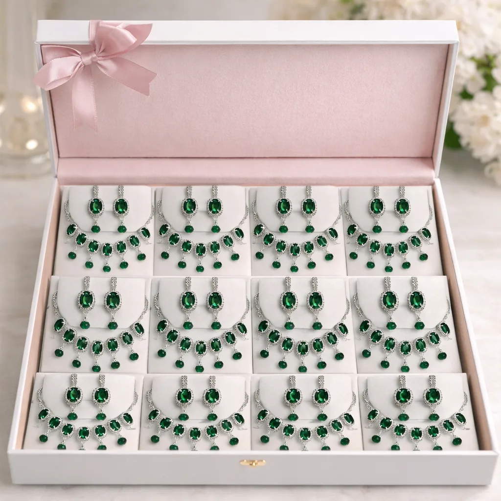 Elegant emerald green crystal bridal necklace set designed for jewellery shops, boutiques, and online resellers. This premium artificial jewellery design comes in a single-design wholesale box, perfect for retail display and fast resale.
