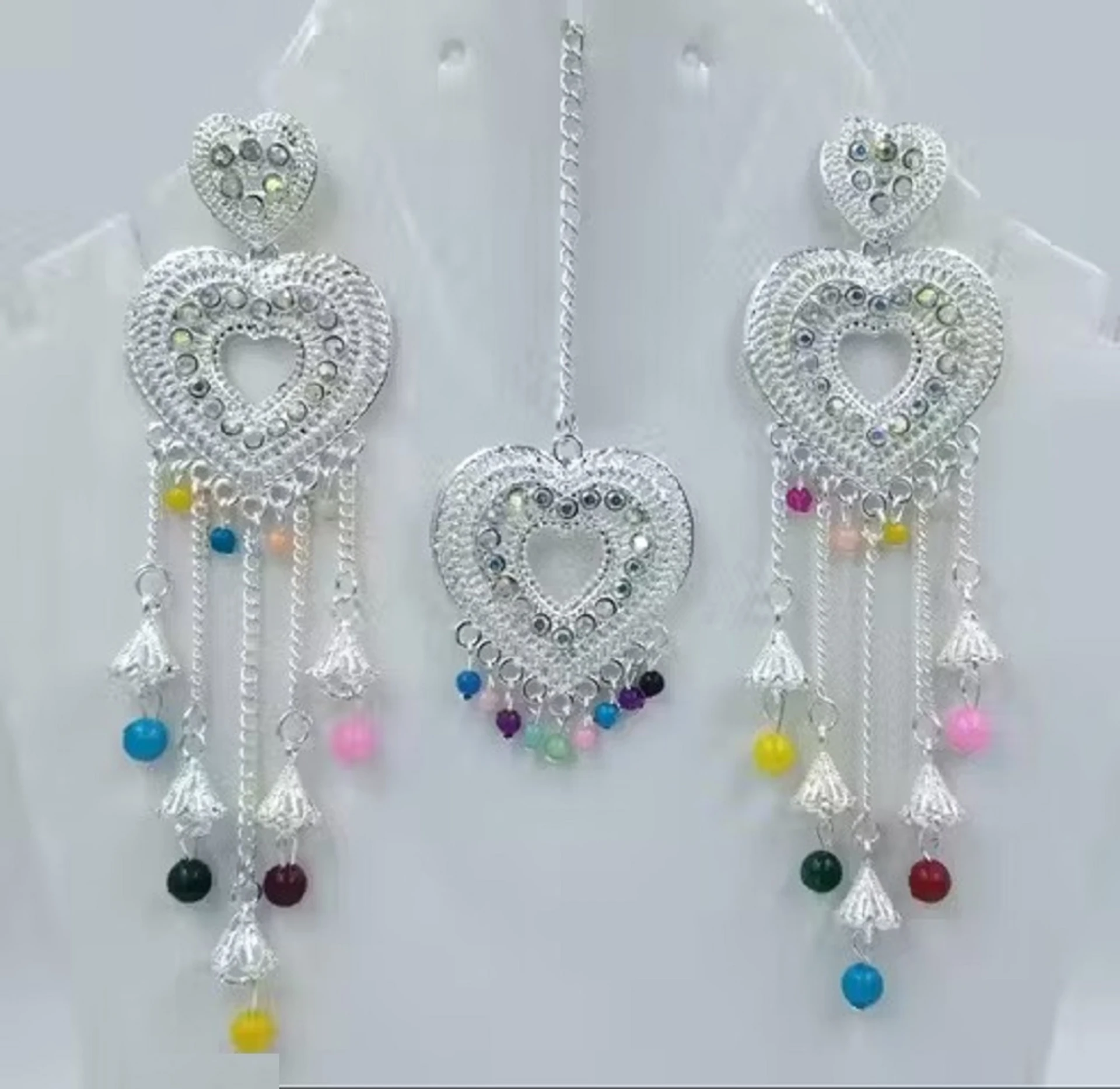 Heart Design Long Earrings with Maang Tikka – Multicolor Drops Wholesale Box