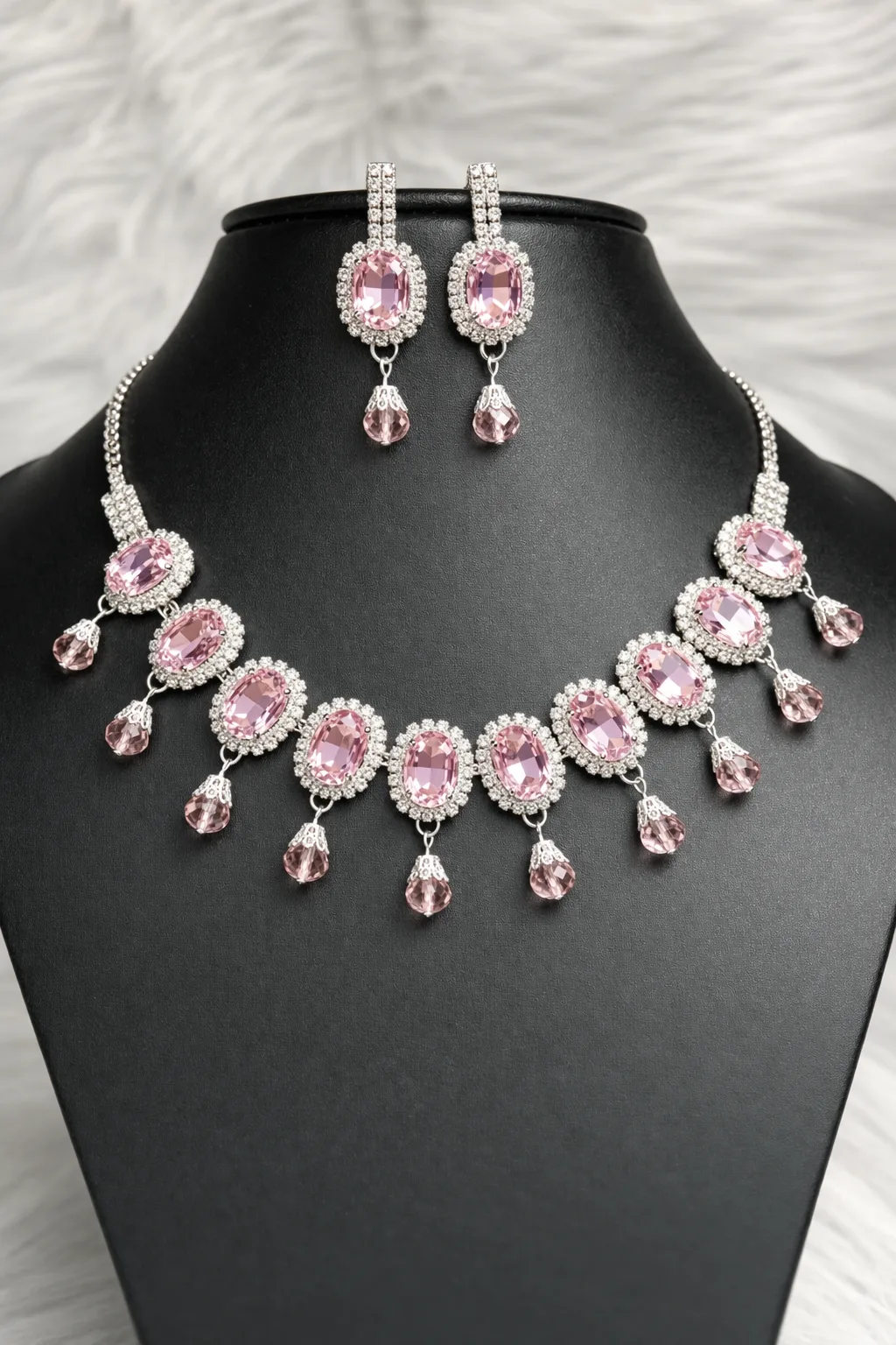 Elegant pink crystal bridal necklace set designed for jewellery shops, boutiques, and online resellers. This trending artificial jewellery design comes in a single-design wholesale box, ideal for retail display and fast resale.