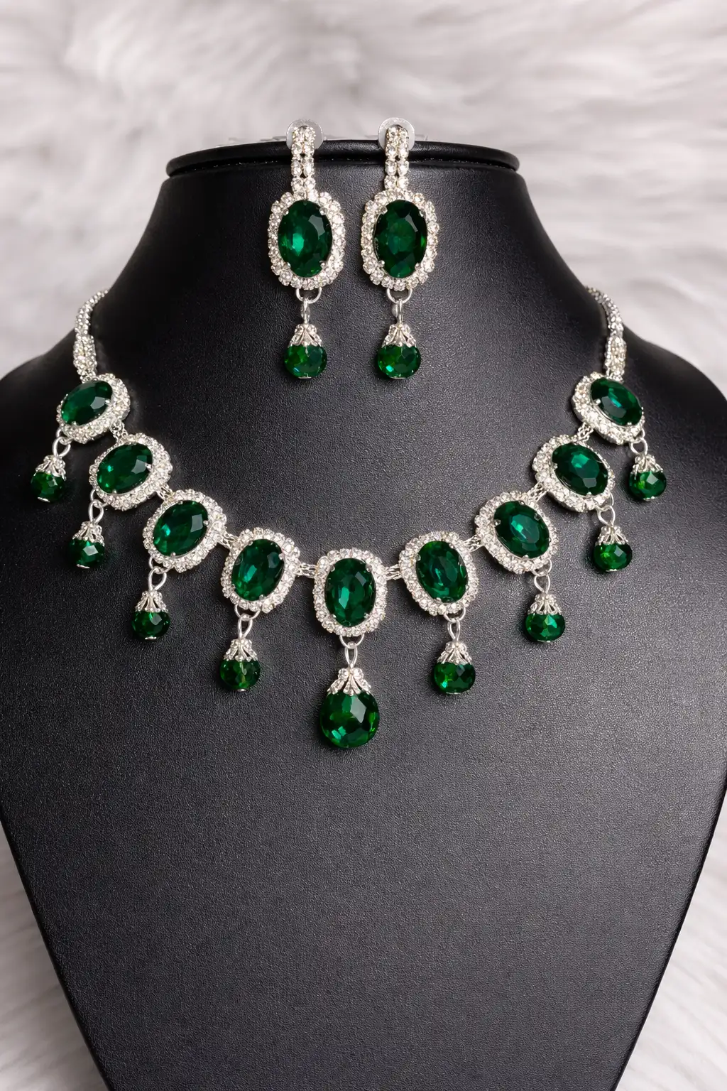 Elegant emerald green square crystal necklace set designed for jewellery shops, boutiques, and online resellers. This premium artificial jewellery design comes in a single-design wholesale box, perfect for display and fast resale.