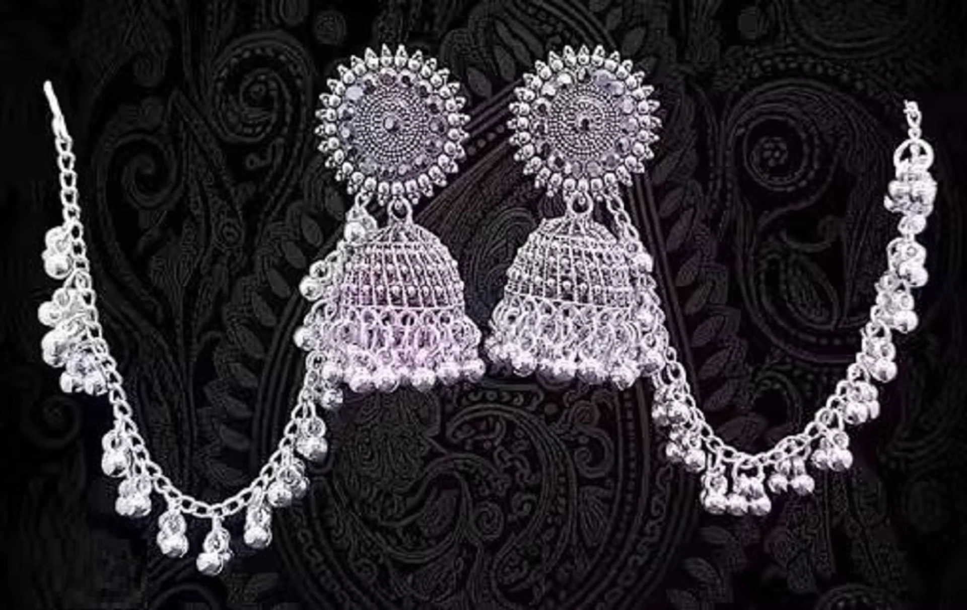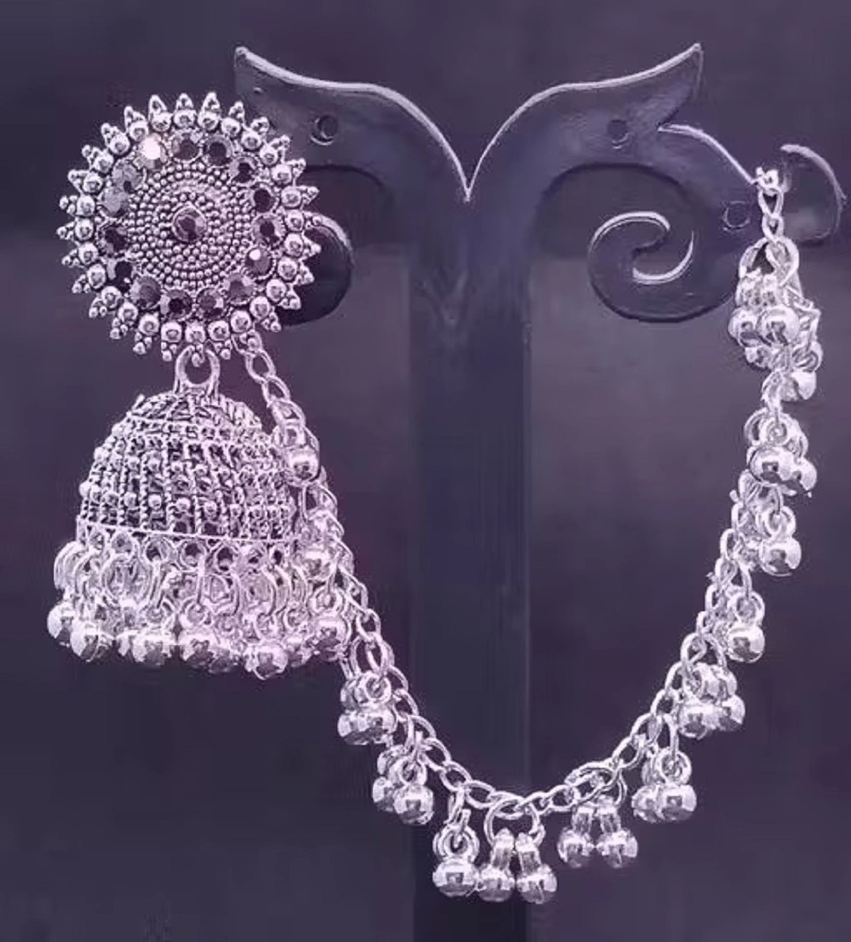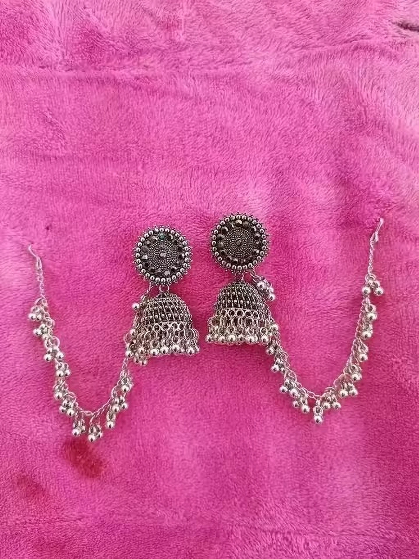 Traditional oxidised jhumka earrings with stylish ear chain (sahara) – perfect for heavy ethnic and festive looks.