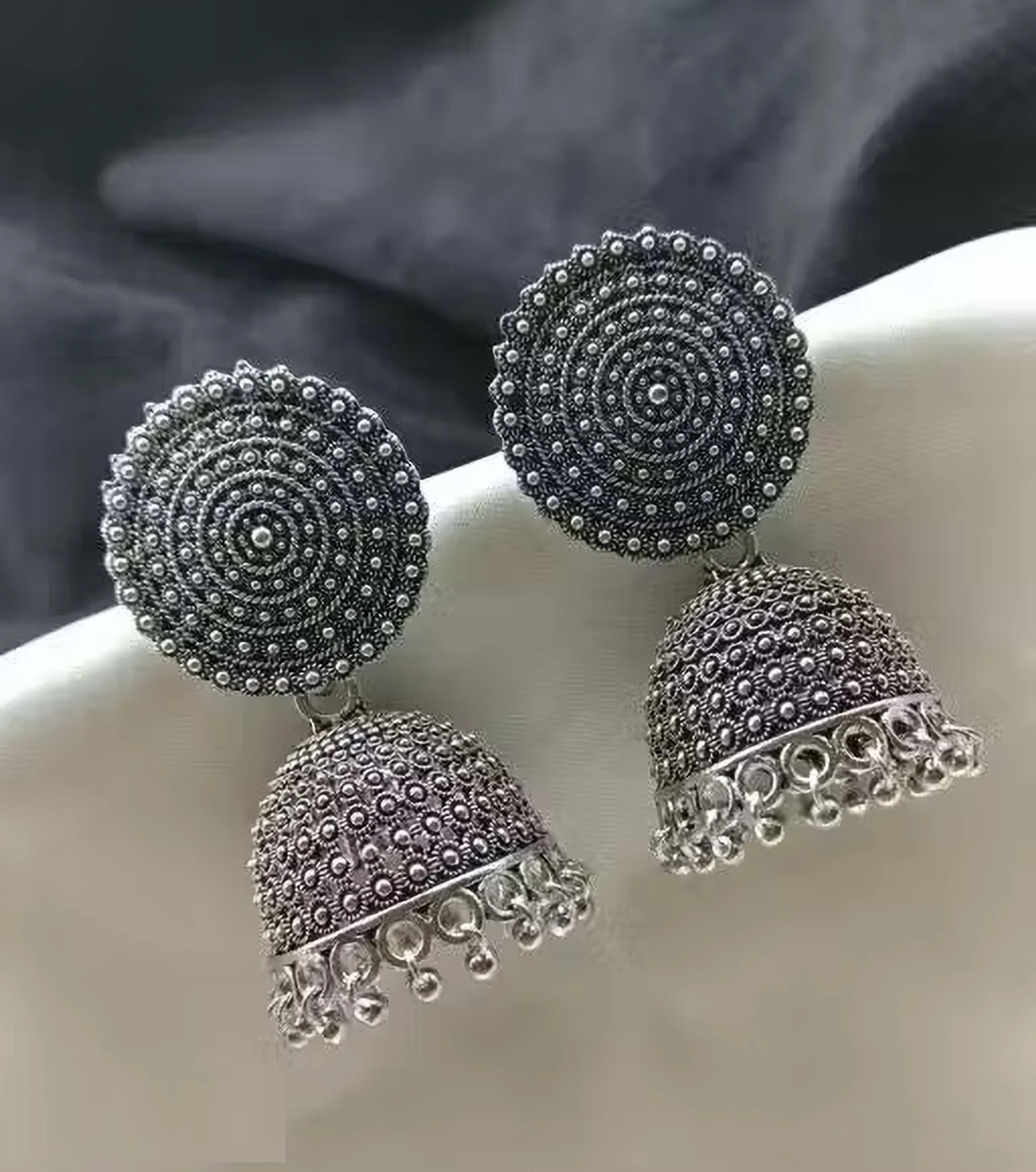 Trendy oxidised silver jhumka earrings with heavy dome design – perfect for ethnic & festive wear.