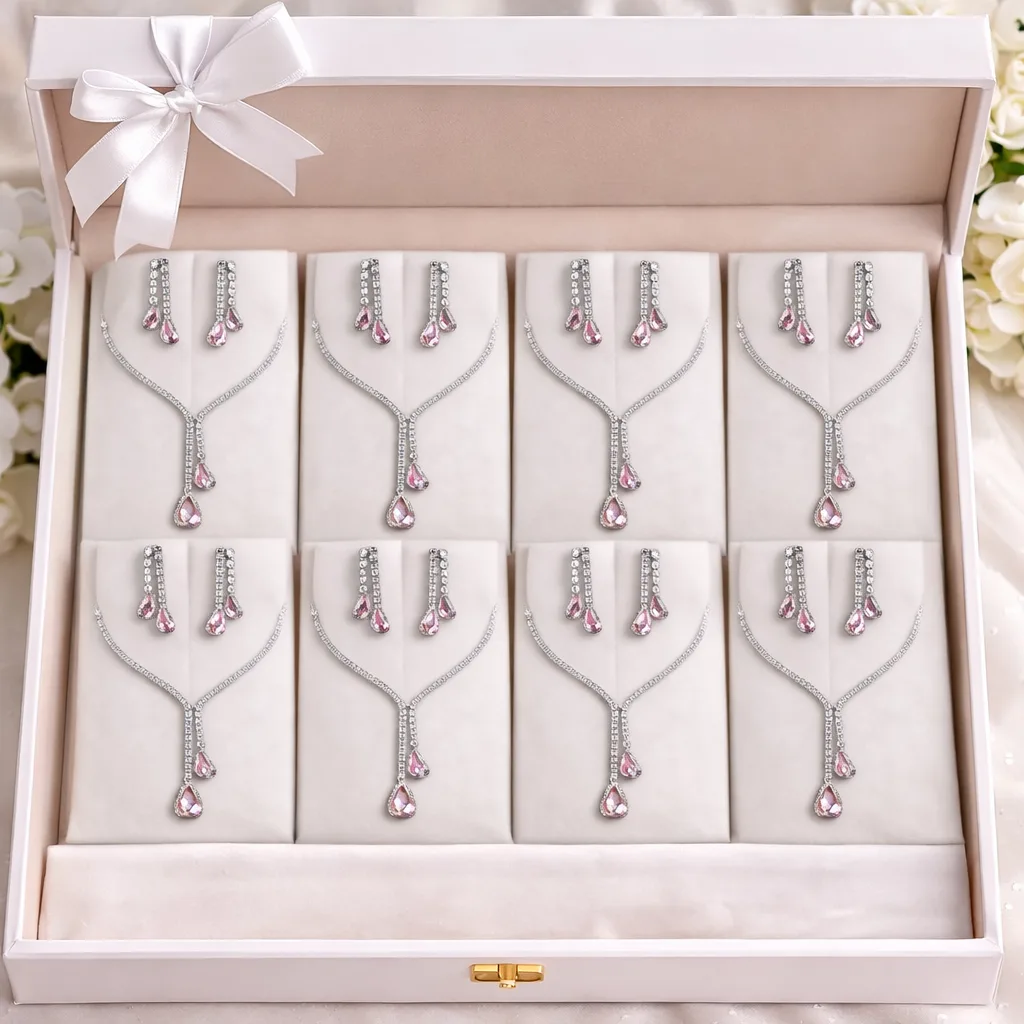 Elegant silver American diamond pink teardrop lariat necklace set designed for jewellery shops, boutiques, and online resellers. This trendy artificial jewellery design comes in a single-design wholesale box, perfect for modern display and fast resale.